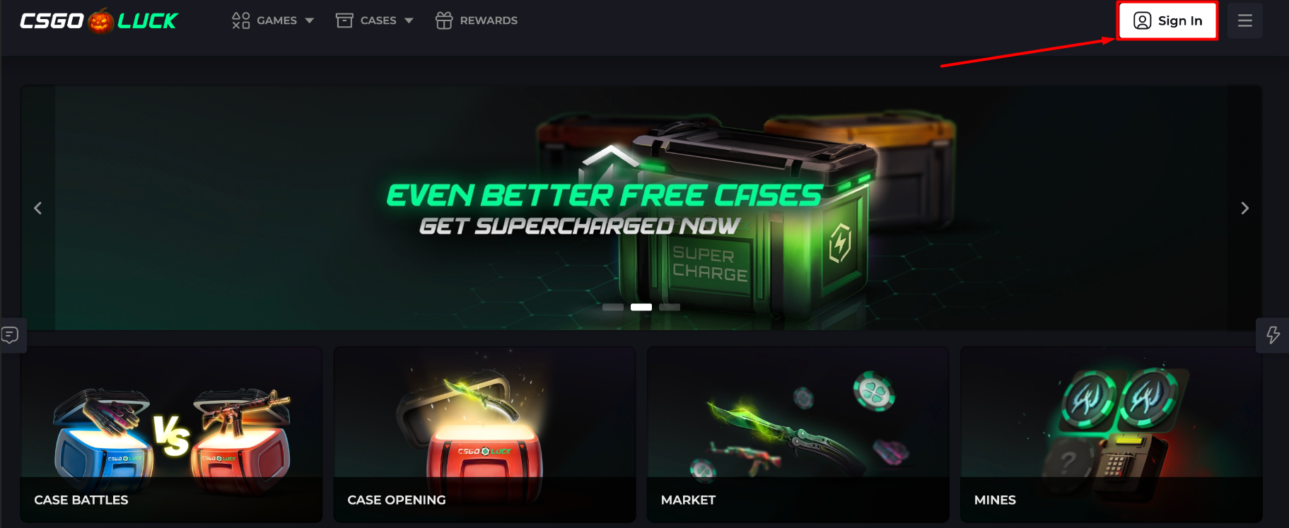 - Start by visiting the official CSGOLuck website and clicking the “Sign In” button.